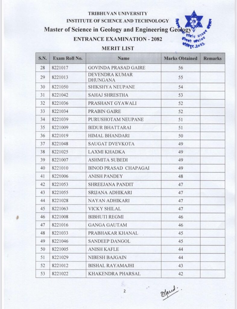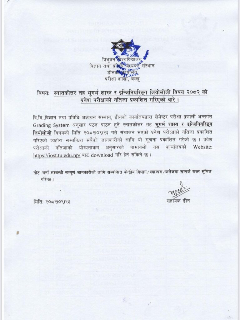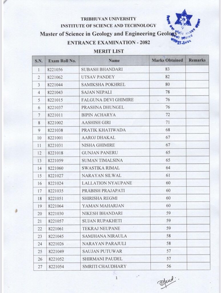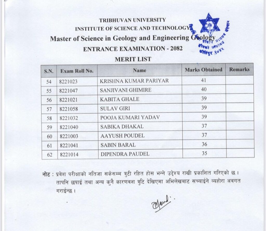 The Central Department of Geology, Tribhuvan University, has officially published the results of the MSc Geology & Engineering Geology Entrance Examination 2082.