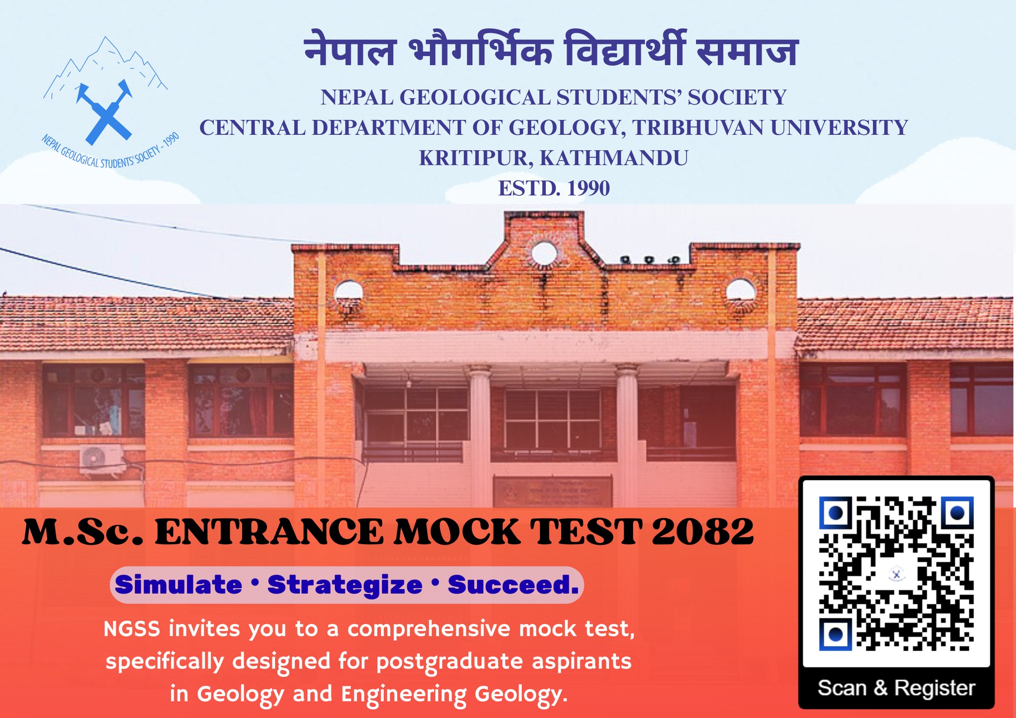 Share now Calling all M.Sc. aspirants in Geology and Engineering Geology! The Nepal Geological Students’ Society (NGSS) proudly announces the M.Sc. Entrance Mock Test 2082 is a rigorously designed simulation examination closely aligned with the standard, format, and difficulty level of the official M.Sc. entrance examination. This initiative offers aspirants a structured and strategic opportunity to: Assess their readiness Refine exam temperament Enhance competitive performance ✅ Why Participate 📊 Objective AssessmentEvaluate your current level of preparation with precision⏱️ Time ManagementPractice effective pacing under authentic exam conditions🧠 Familiarity with FormatUnderstand question patterns and difficulty distribution🎯 Focused RevisionIdentify strength areas and priority topics for final preparation🏆 Competitive EdgePosition yourself for a strong and confident entrance performance We encourage all students, faculty, and well-wishers to share this opportunity with fellow aspirants preparing for the M.Sc. entrance examination in Geology and Engineering Geology. “Geology for a Sustainable Future” About Author NGSS TU See author's posts Post navigation Notice Regarding Formation of Sub-committees Happy New Year 2026 & National Dhaka Topi Day 🎉