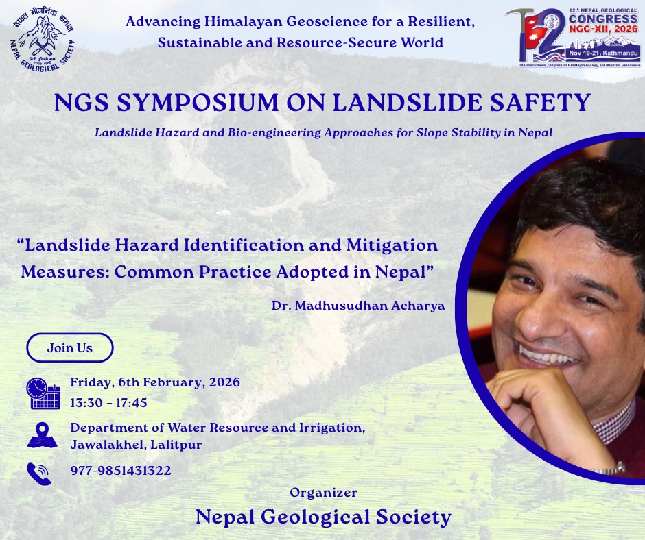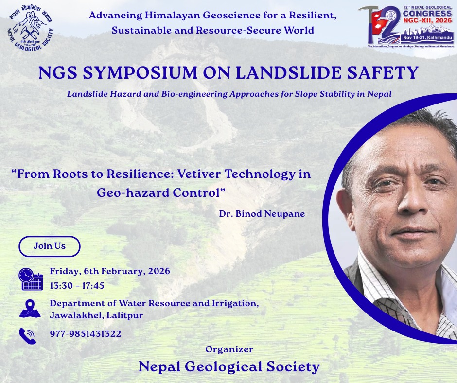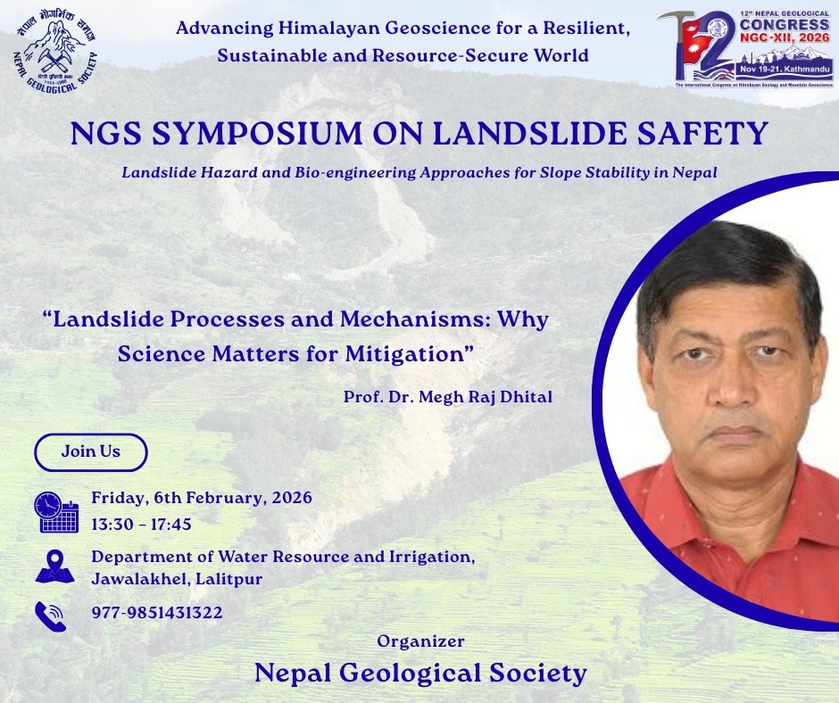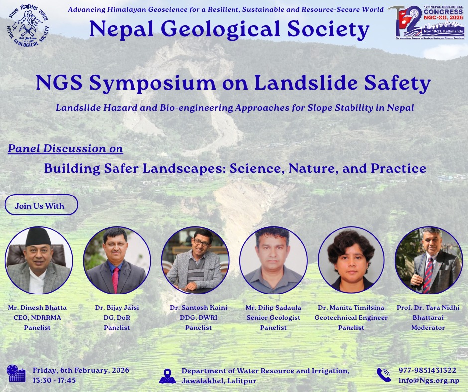 Share now Advancing Himalayan Geoscience for a Resilient, Sustainable, and Resource-Secure World 🤝 NGSS Collaborates with NGS The Nepal Geological Students’ Society (NGSS) is pleased to announce its official collaboration with the Nepal Geological Society (NGS) in the organization of the NGS Symposium on Landslide Safety. This landmark symposium, themed“Landslide Hazard and Bio-engineering Approaches for Slope Stability in Nepal” reflects a shared commitment to advancing Himalayan geoscience for a resilient, sustainable, and resource-secure world. 🎤 Keynote & Technical Presentations 🔹 Prof. Dr. Megh Raj Dhital “Landslide Processes and Mechanisms: Why Science Matters for Mitigation” Prof. Dr. Dhital is a pioneering figure in Himalayan geoscience. His seminal contributions to landslide dynamics, rock mechanics, and engineering geology have shaped academic thought and professional practice across Nepal and the region. His keynote will underscore the indispensable role of fundamental science in effective hazard mitigation. 🔸 Dr. Madhusudhan Acharya “Landslide Hazard Identification and Mitigation Measures: Common Practice Adopted in Nepal” Dr. Acharya will present a comprehensive overview of field-based practices currently employed in Nepal for landslide hazard assessment and mitigation, bridging the gap between theoretical knowledge and on-ground implementation. 🔸 Dr. Binod Neupane “From Roots to Resilience: Vetiver Technology in Geo-hazard Control” Dr. Neupane will introduce Vetiver Grass Technology, a cost-effective, nature-based solution for slope stabilization and erosion control. His presentation will showcase successful applications of this bioengineering innovation in Nepal’s fragile Himalayan terrain. 🧠 Panel Discussion “Building Safer Landscapes: Science, Nature, and Practice” A distinguished multi-stakeholder panel will engage in a high-level dialogue on integrating scientific knowledge, bioengineering solutions, and institutional practice for landslide risk reduction in Nepal. Panelists: Prof. Dr. Tara Nidhi Bhattarai – Moderator Mr. Dinesh Bhatta—CEO, NDRRMA Dr. Bijay Jaisi—Director General, Department of Roads Dr. Santosh Kaini—Deputy Director General, DWRI Mr. Dilip Sadaula—Senior Geologist Dr. Manita Timilsina—Geotechnical Engineer About Author NGSS TU See author's posts Post navigation 28th National Earthquake Safety Day 2082 – Joint Awareness Stall by NGS & NGSS