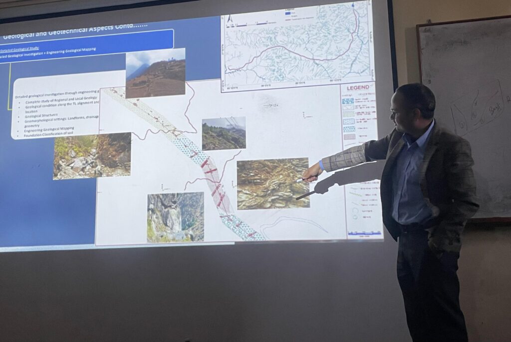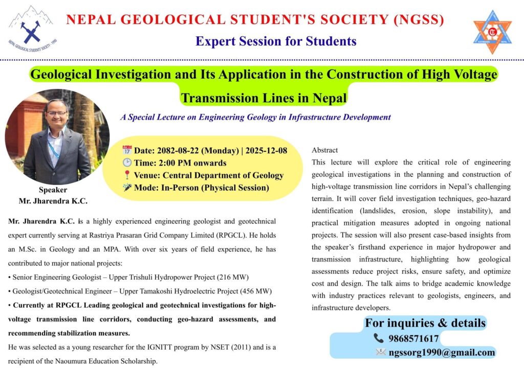 Share now KATHMANDU, 2082-08-22—The Nepal Geological Students’ Society (NGSS) successfully hosted an expert lecture titled “Geological Investigation and Its Application in the Construction of High Voltage Transmission Lines in Nepal.” Held in person at the Central Department of Geology in Kirtipur, the session served as a valuable platform for knowledge exchange between academia and industry. The lecture was delivered by Mr. Jharendra K.C., a seasoned engineering geologist and geotechnical expert from Rastriya Prasaran Grid Company Limited (RPGCL). Drawing on extensive field experience from major national projects, including the Upper Tamakoshi and Upper Tirushili hydropower initiatives, Mr. K.C. provided a practical and in-depth analysis of geo-hazard assessment, slope stability, and risk mitigation in transmission line development across Nepal’s demanding terrain. The session fostered meaningful dialogue on integrating geological insights into infrastructure planning, with emphasis on safety, cost-effectiveness, and sustainable design. NGSS extends its sincere appreciation to Mr. Jharendra K.C. for his invaluable contribution and to all participants for their active engagement. The society remains committed to organizing such informative programs to enhance the professional readiness of emerging geologists. About Author NGSS TU See author's posts Post navigation NGSS Successfully Hosts Special Lecture on Poster Creation and Design Three-Day AutoCAD Training Program Concluded Successfully