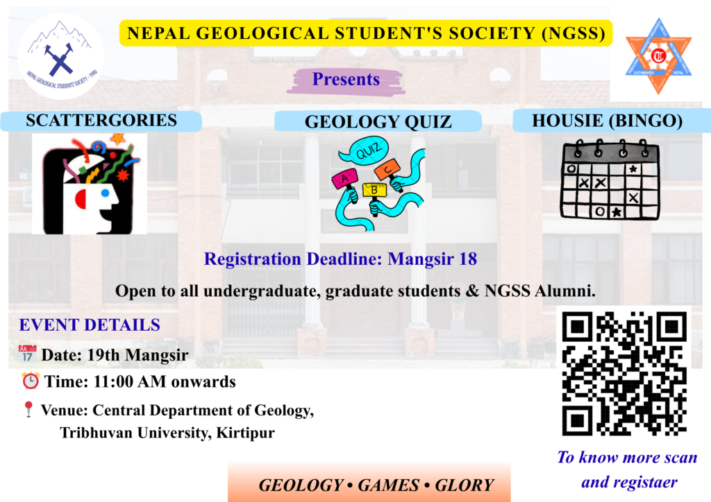 Share now The Nepal Geological Students’ Society (NGSS) is excited to host the NGSS Games Program, offering a mix of fun, learning, and networking for geology students and alumni. Activities: Scattergories, Geology Quiz, and Housie Date & Time: 19th Mangsir (5 December, Friday), 11:00 AM onwardsVenue: Central Department of Geology, Tribhuvan University, KirtipurRegistration Deadline: 18th MangsirParticipation Fee: NPR 25 per person per game Eligibility: Bachelor’s and Master’s Geology students NGSS Alumni members Prizes: Certificates, books or diaries, and a special NGSS token of appreciation. All participants will receive NGSS souvenirs.Register Here: https://forms.gle/d3Lxx44XUsi5jFts7 Game rules will be shared one day before the event. NGSS Games Program – Event Highlights The Nepal Geological Students’ Society (NGSS) successfully concluded today’s interactive session featuring Scattergories, the Geology Quiz, and Geological Housie. We sincerely thank all participants for their active involvement and support. Your enthusiasm motivates us to continue organizing engaging programs like this in the future. About Author NGSS TU See author's posts Post navigation NGSS Collective Cleanliness Drive Successfully Completed TALK Program Successfully Concluded