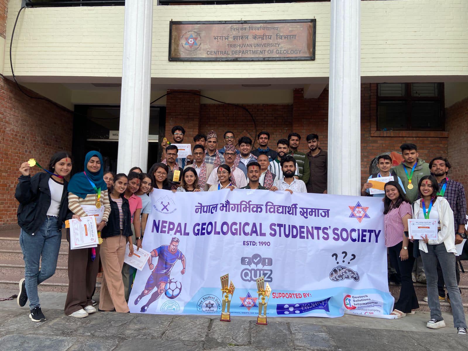 Share now The prize distribution program for the NGSS Games 2024 took place on October 1,2024, celebrating the achievements of participants in Boys and Girls Futsal, Scattergories, and Quiz games. The event, held at the Department, was a vibrant showcase of talent and teamwork, reflecting the commitment of NGSS to foster a well-rounded educational environment. Chaired by esteemed figures in academia and community leadership, including Prof. Dr. Dhyanendra Bahadur Rai (Principal, TU) , Mr. Churna Bahadur Wali (President, NGS) , Prof. Dr. Dinesh Pathak (HOD, CDG) , and Mr. Shyam Raj Ojha (President, FSU) , the ceremony highlighted the importance of sports and intellectual pursuits in student development. In his opening remarks, Prof. Dr. Dhyanendra Bahadur Rai emphasized the role of games in nurturing teamwork and discipline. “These activities not only enhance physical fitness but also build critical life skills. We are dedicated to creating opportunities for our students to excel both on and off the field,” he stated. Mr. Churna Bahadur Wali expressed gratitude to all participants and organizers, noting the impressive turnout and enthusiasm surrounding the events. “The spirit of competition we witnessed this year has been truly inspiring. It’s a testament to the hard work and determination of our students,” he remarked. The games featured fierce competition, with teams showcasing their skills in Futsal, demonstrating agility and teamwork, while the Scattergories and Quiz games tested participants’ creativity and knowledge. Participants from various schools came together to compete, fostering camaraderie and sportsmanship. Prof. Dr. Dinesh Pathak took the opportunity to highlight the academic benefits of such events. “Engagement in games and quizzes not only sharpens the mind but also prepares students for future challenges. We must continue to support such initiatives that promote a balanced education,” he said. Mr. Shyam Raj Ojha concluded the speeches by urging the students to remain committed to their studies while also participating in extracurricular activities. “Both academics and sports are vital for your overall growth. We are here to support you in every step of your journey,” he affirmed. The ceremony culminated in the distribution of prizes, with winners and participants receiving medals and certificates. The atmosphere was filled with cheers and applause as the achievements of the students were recognized, celebrating their hard work and dedication. The NGSS Games 2024 not only showcased the athletic and intellectual capabilities of students but also reinforced the institution’s commitment to nurturing well-rounded individuals ready to take on future challenges. As the event concluded, the sense of community and shared purpose among participants and organizers was palpable, setting a positive tone for future events. Welcoming Guests with Khada and Maya ko Chino “Celebrating the remarkable journey of Bishwo Khanal dai at his farewell with ‘Maya Ko Chino.’ His dedication and integrity have left an indelible mark on the department. Wishing him all the best in his future endeavors!” Best Player Award Awarded to : Khagendra DahalOn his behalf collected by Mr. Gunanidhi Pokharel Winners of Boys Futsal (Team The Boyz) Winners of Girls Futsal ( Team Seismic Shooters) Top Goal Scorer AwardAwarded to: Kshitiz Regmi Boys Futsal Runner-up (Team Senior) Winners of Quiz Competition Winners of Scattergories ( Team The Gneiss Guys) Group Photo at the end of the programme About Author NGSS See author's posts Post navigation NGSS GAMES 2024 NOTICE! Associate Membership open for Bachelors Students