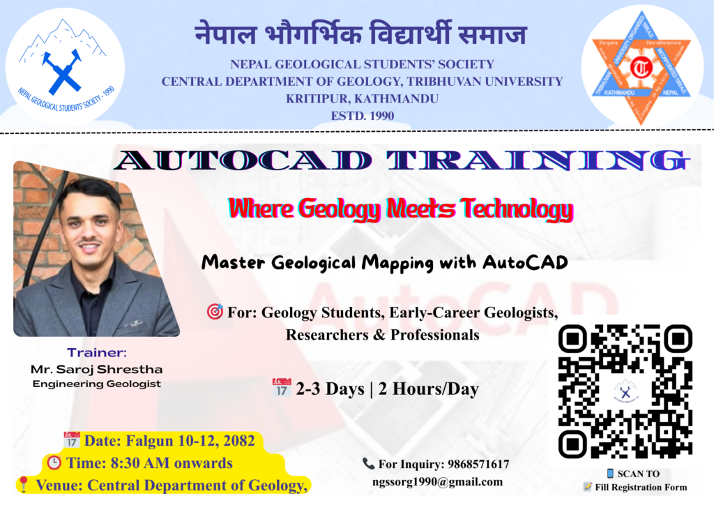 The three-day AutoCAD training program, Where Geology Meets Technology,” concluded successfully today. Organized by the Nepal Geological Students’ Society (NGSS), the program was conducted from 22 to 24 February 2026 at the Central Department of Geology.